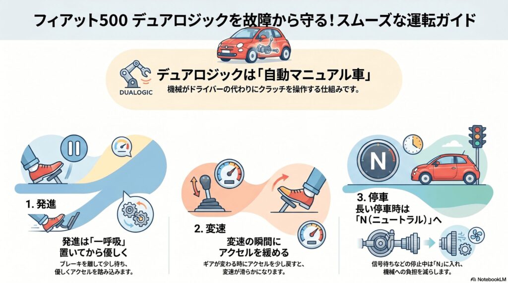 フィアット500の心臓部とも言える「デュアロジック」は、一般的なオートマ車とは仕組みが違います。「機械がクラッチ操作をしてくれるマニュアル車」だと考えると分かりやすいかも。故障を防いでスムーズに走るためのコツをまとめてみました。