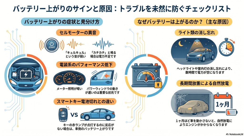 バッテリーが上がるのには、必ずと言っていいほど理由があります。まずは「自分の車に何が起きているのか」を正しく把握することが、スムーズな対処への第一歩ですよ。